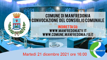 Il Consiglio Comunale di Martedì 21 dicembre 2021 con inizio alle ore 16:00 sarà trasmesso in diretta streaming a cura di Manfredoniatv.it.
