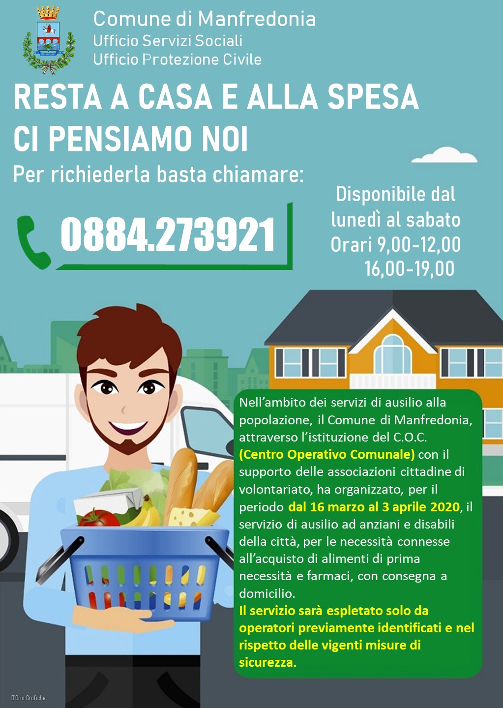 Per il servizio di consegna farmaci e spesa a domicilio, il numero è 0884.273921 attivo dal lunedì al sabato dalle 9 alle 12 e dalle 16 alle 19.