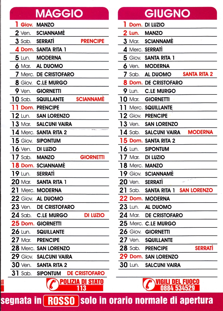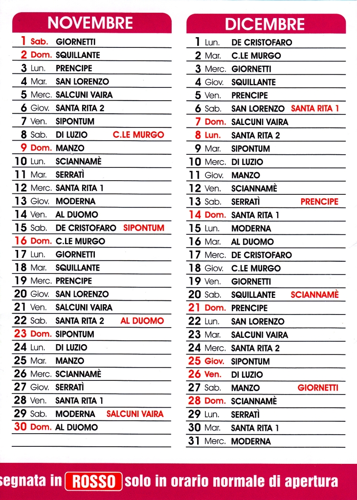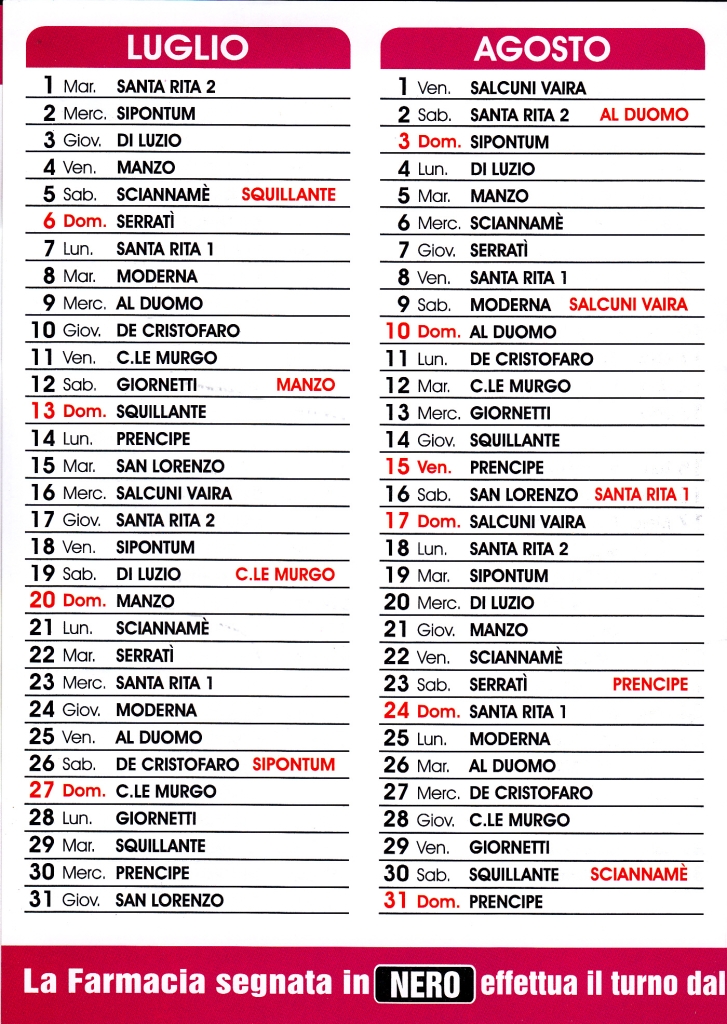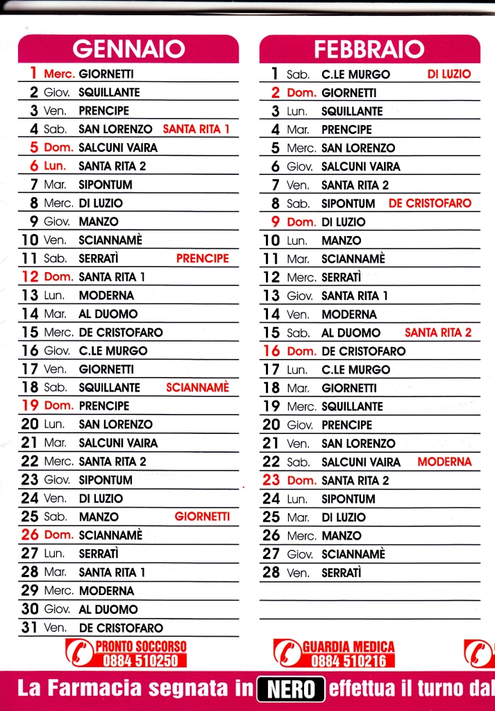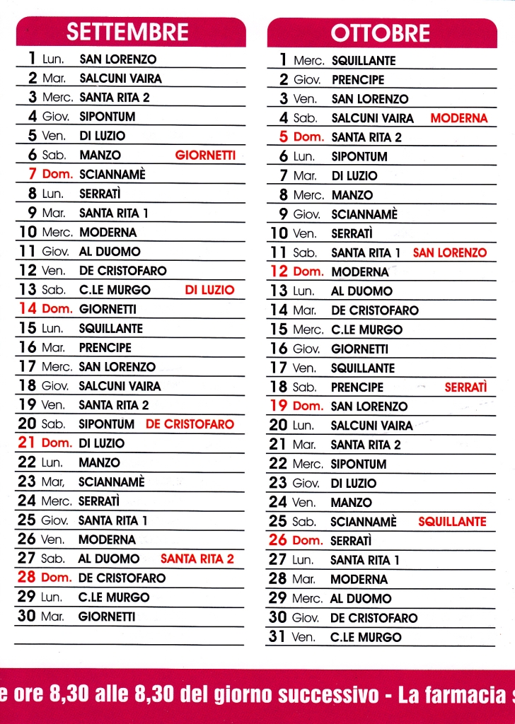 La farmacia segnata in nero effettua il turno dalle ore 8,30 alle 8,30 del giorno successivo – La farmacia segnata in rosso solo in orario normale di apertura