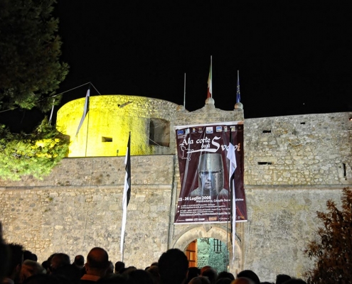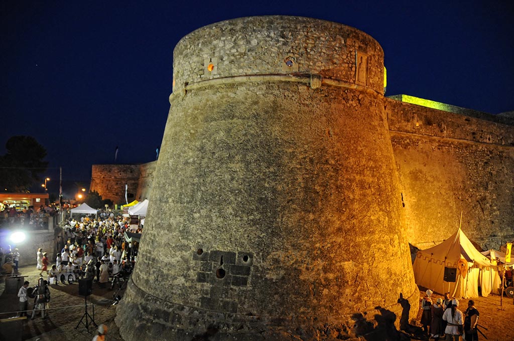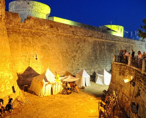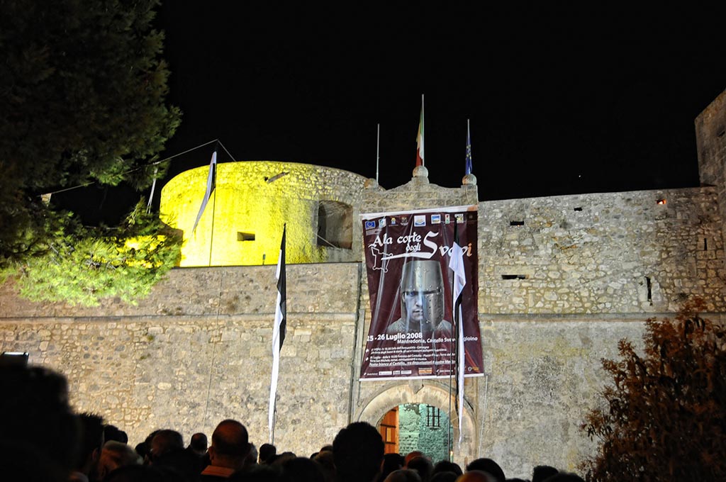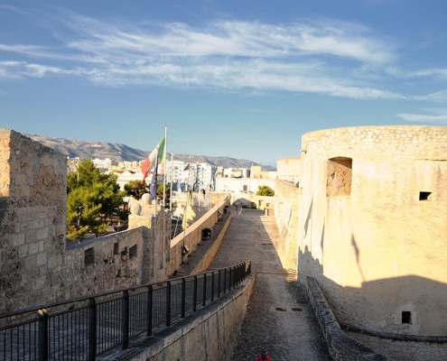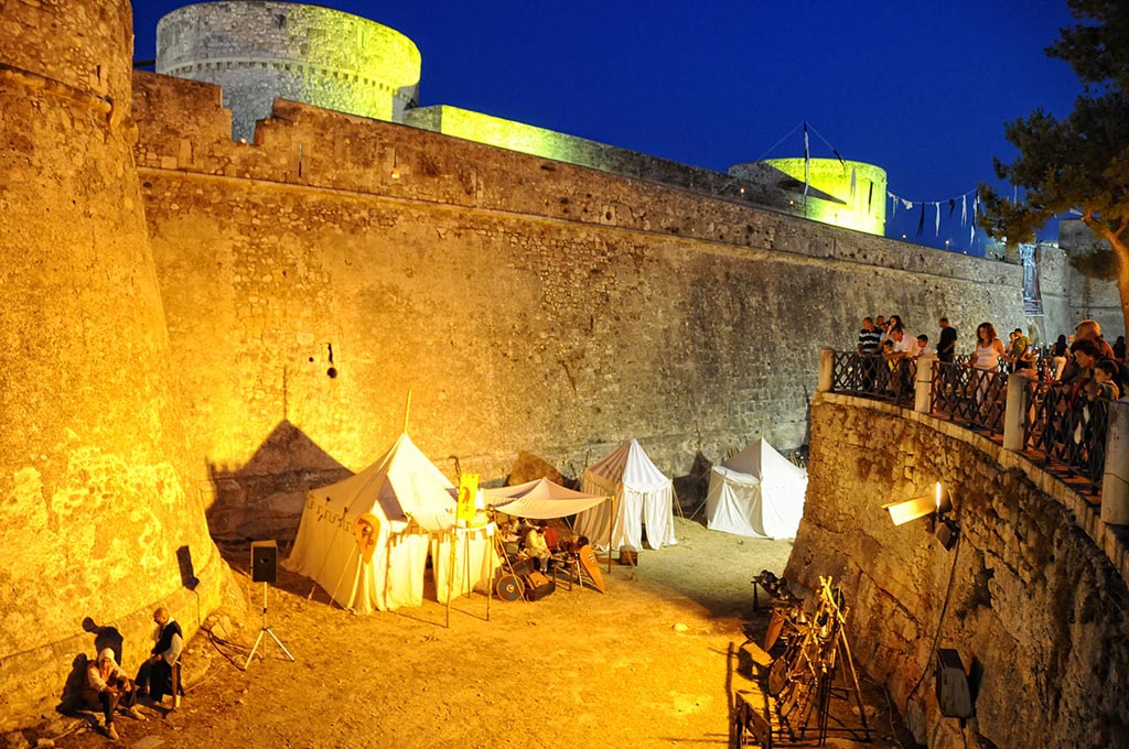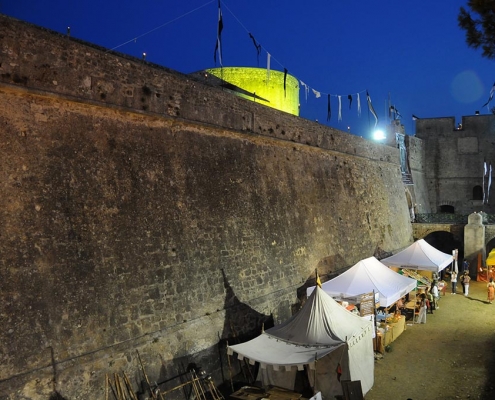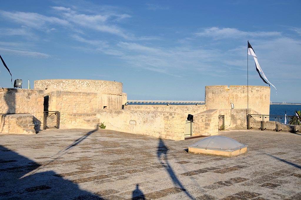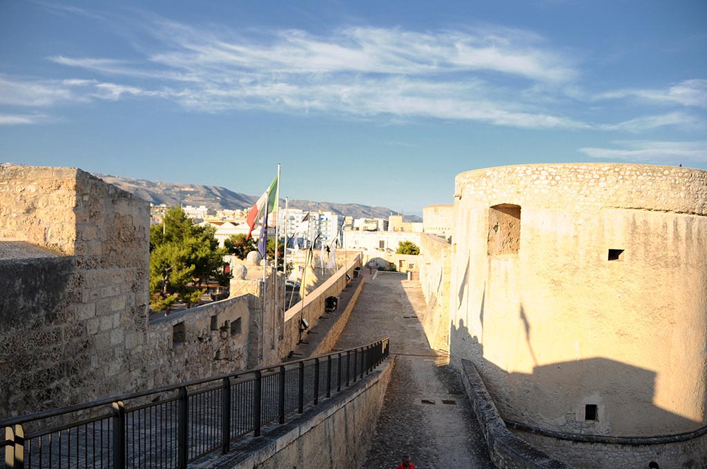 Con il governo della casa d’Aragona, (1442), si assiste ad un ulteriore processo di visibile trasformazione del Castello. Negli ultimi anni del XV secolo, infatti, gli Aragonesi, all’interno di un complessivo progetto di fortificazione delle strutture difensive delle più importanti città costiere, dispongono per il Castello di Manfredonia la costruzione di una nuova cortina muraria inglobante la struttura primitiva. A queste mura viene data una leggera inclinazione a scarpa tale da renderle più rispondenti alle mutate esigenze dell’arte difensiva conseguenti all’uso dell’artiglieria.