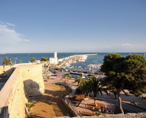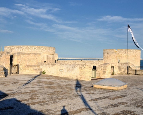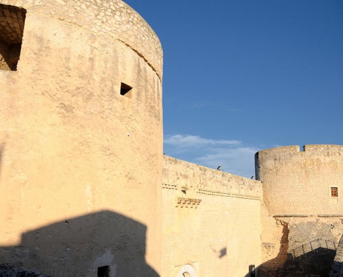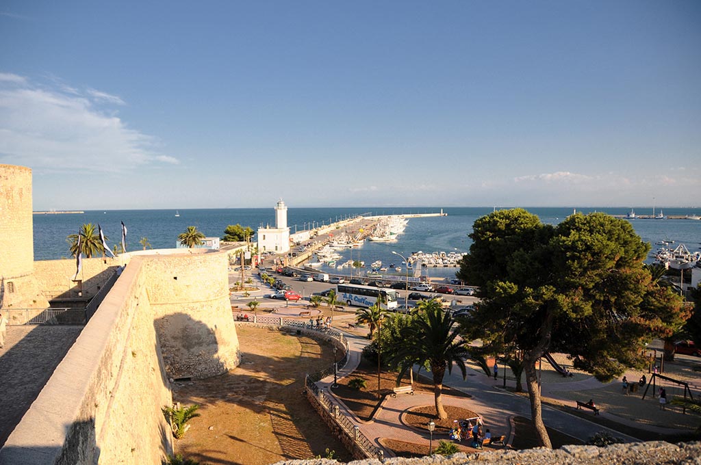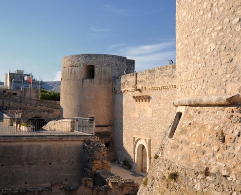Il castello di Manfredonia non è il frutto di un progetto unitario concepito fin dalla sua origine così come oggi ci appare, ma è il risultato di trasformazioni, ampliamenti e rifacimenti avvenuti in epoche diverse. In origine tutta la struttura consisteva in uno spazio quadrilatero racchiuso da una cinta muraria raccordata da cinque torri a pianta quadrata, di cui quattro poste agli angoli e la quinta ubicata presumibilmente nei pressi della porta principale di Nord-est. Tale primitivo impianto non corrisponde più alla realtà attuale in quanto della quinta torre restano solo poche tracce, mentre le altre, ad eccezione di quella posta a Sud-est, hanno cambiato la loro struttura formale. Infatti, un’opera di inglobamento avvenuta in epoca successiva, ha trasformato le precedenti strutture quadrangolari in torrioni a pianta cilindrica.
