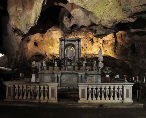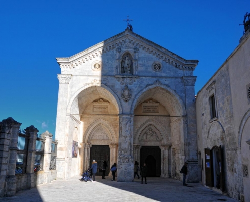 Il richiamo più forte per i pellegrini è costituito dal Santuario di S. Michele Arcangelo, il cui ingresso, affiancato dal campanile ottagonale, è costituito da due arcate ogivali oltre le quali si sviluppano in discesa le cinque rampe tortuose che conducono alla spelonca racchiusa da preziose porte bronzee ageminate dell’XI secolo. All’interno della grotta si ammira la cattedra arcivescovile, opera dell’Acceptus (sec. XI), e la statua marmorea di S. Michele, opera del Sansovino (sec. XVI). Lateralmente all’ingresso l’altare dedicato a S. Francesco che qui si recò pellegrino nel 1216 e, più avanti, il coro in noce cinquecentesco e la Cappella delle Reliquie con la croce in filigrana recante un frammento della croce di Cristo, dono di Federico II di Svevia.
