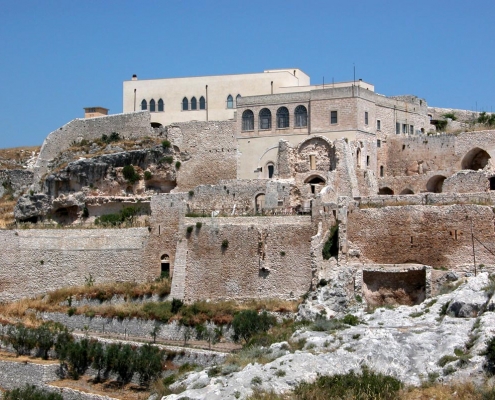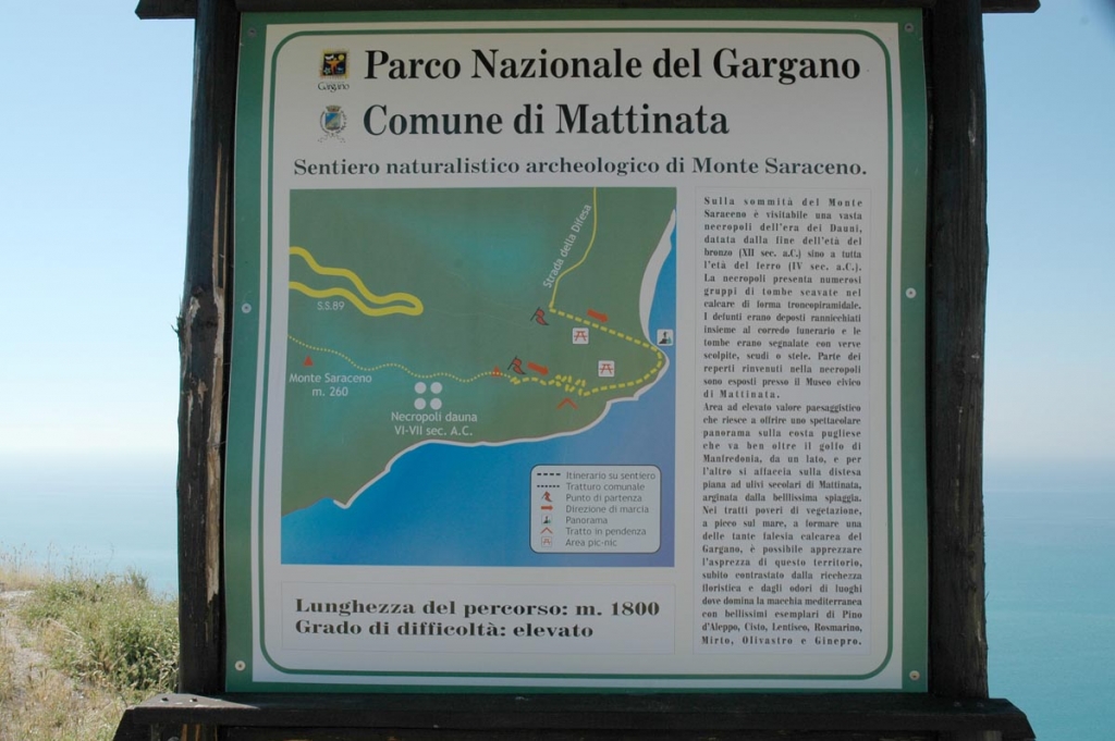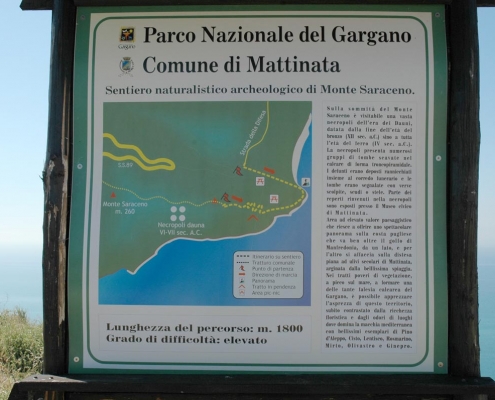 Il nostro itinerario prosegue verso Mattinata lungo la S.S. 89; prima di giungere alla galleria imboccare sulla sinistra la strada panoramica (che consente di ammirare le distese di uliveti digradanti sul mare) e dopo pochi chilometri si giunge al Bivio La Cavola; qui lasciate le auto, tramite un sentiero brecciato in salita si arriva in un’ora alla necropoli di Monte Saraceno, frequentata dalla Età finale del Bronzo sino a tutta la seconda Età del Ferro con circa 400 tombe daunie scavate nel banco calcareo. Secondo una leggenda da questo strapiombo di 250 metri si sarebbe precipitato Ettore Fieramosca a causa dell’amore non corrisposto per Ginevra. Reperti provenienti da questo importante sito assieme alle orme di dinosauro ritrovate sul porto si possono ammirare nel Museo Civico di Mattinata.