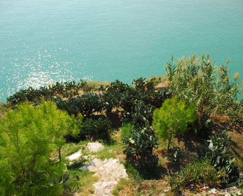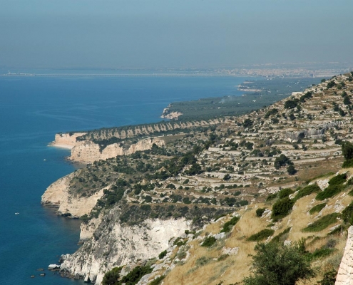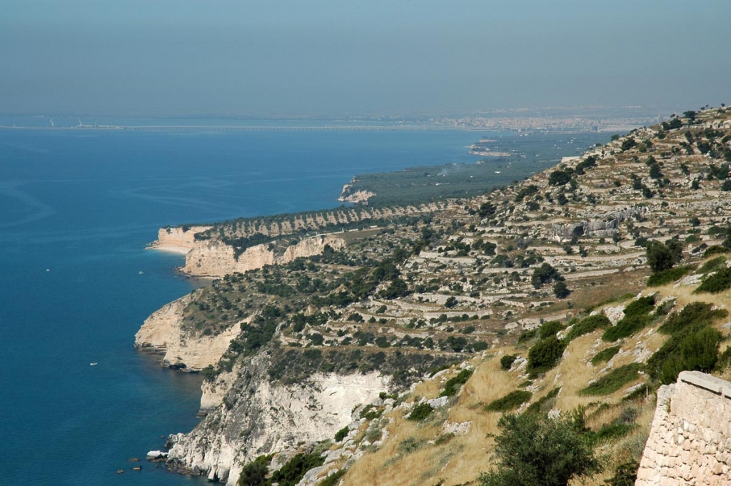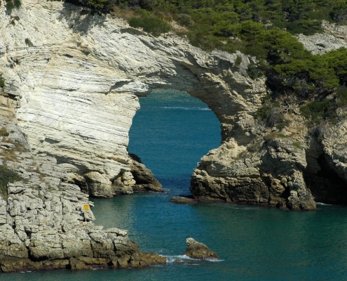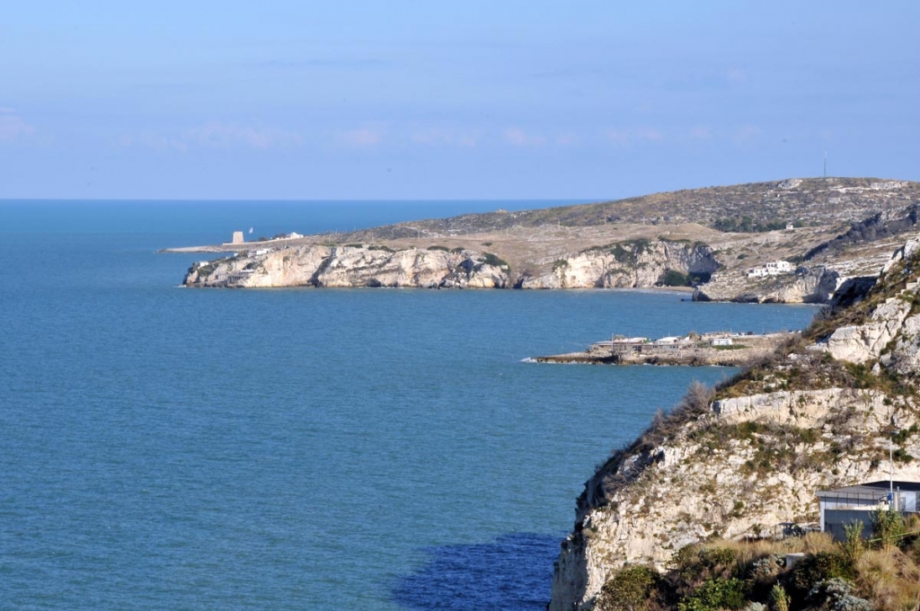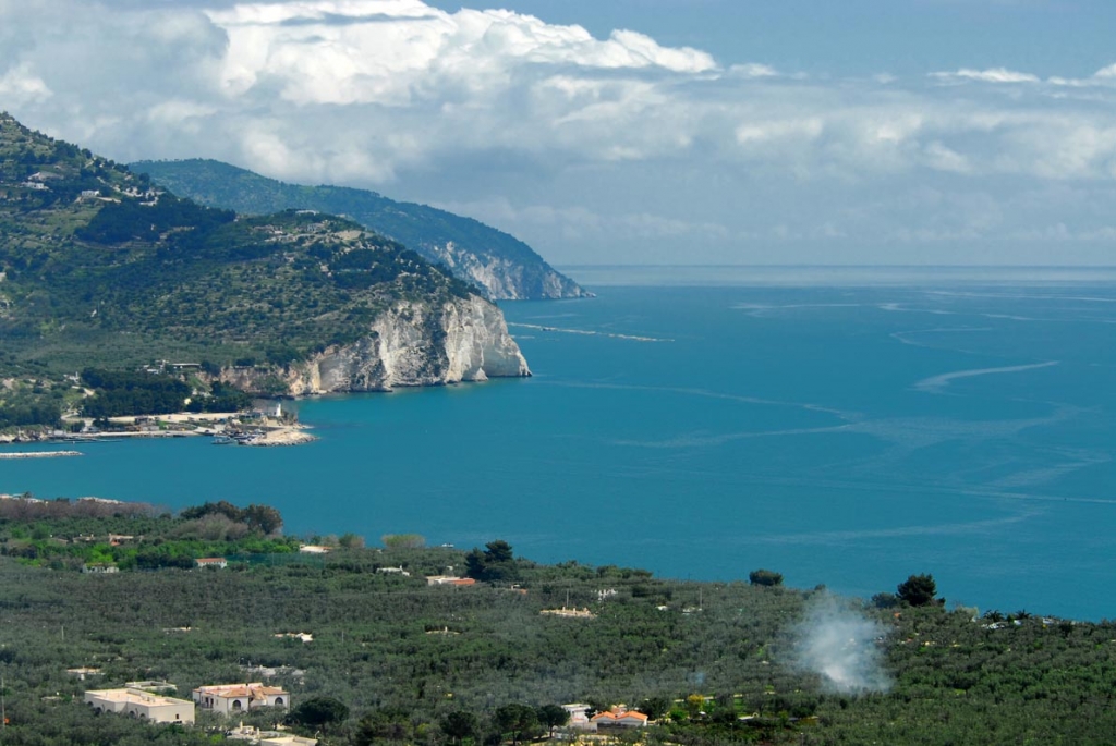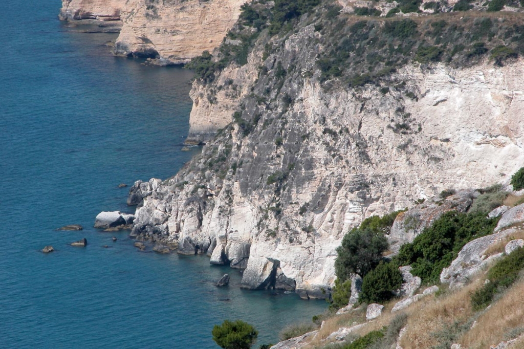 2A) Scegliendo la prima, a partire da Manfredonia, percorrendo la S.S. 89 e quindi imboccando la panoramica, si ha l’opportunità di godere di vedute molto suggestive sulle falesie calcaree coperte di pino d’Aleppo a picco sul mare; dopo 15 chilometri si raggiunge, immersa in un mare di uliveti, la cittadina di Mattinata (mt. 75), l’antica Matinum, dalle caratteristiche case basse e bianche. Proseguendo in direzione di Vieste sul tragitto si incontrano baie splendide come Vignanotica, Baia delle Zagare, dei Gabbiani, dei Campi, di San Felice (con l’omonimo architello) ricche di grotte marine d’inestimabile bellezza (raggiungibili in barca), faraglioni, archi rocciosi e torri costiere d’avvistamento erette nel 1600.