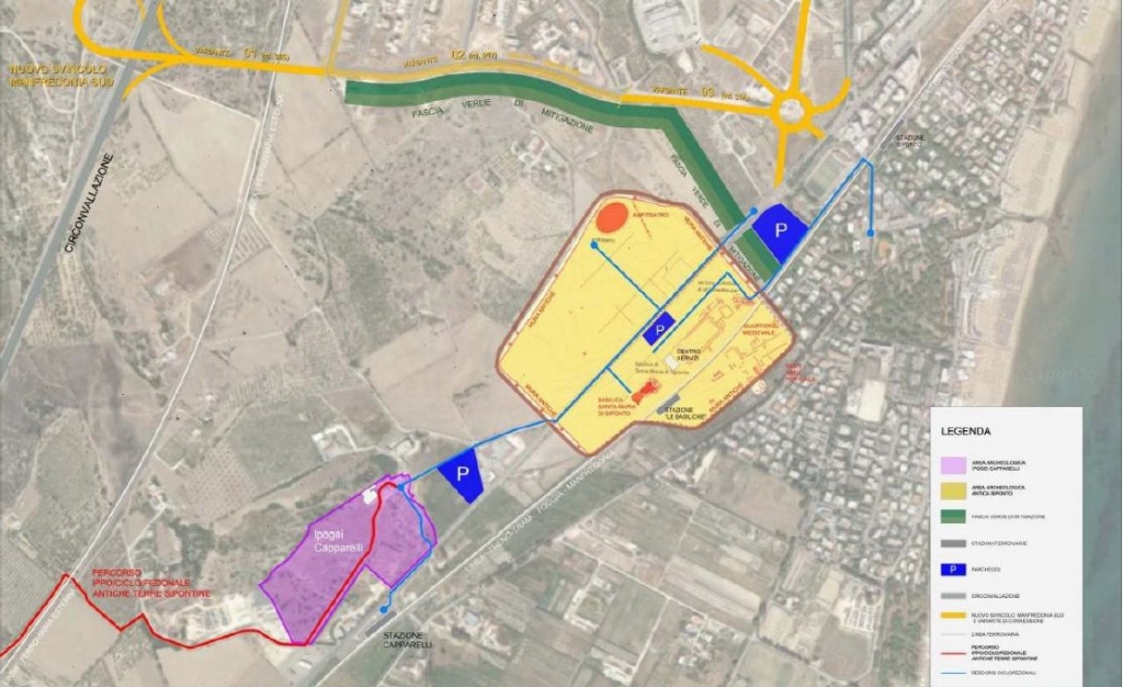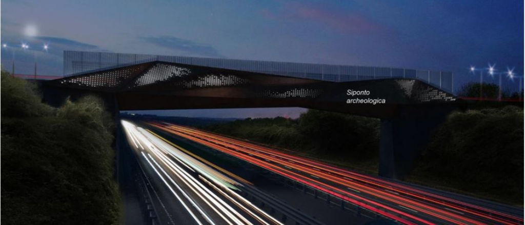Il progetto principale prevede la costruzione di un nuovo cavalcavia sulla circonvallazione, denominato “Siponto archeologica”, pensato come un landmark nel paesaggio garganico ed un elemento identitario tale da segnalare agli automobilisti in transito verso il Gargano la presenza del Parco Archeologico di Siponto.