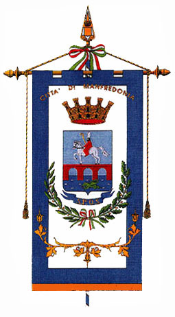 Drappo di bianco con la bordatura di azzurro, riccamente ornato di ricami d’oro, e caricato dallo stemma con la iscrizione centrata in oro, recante la denominazione della Città.